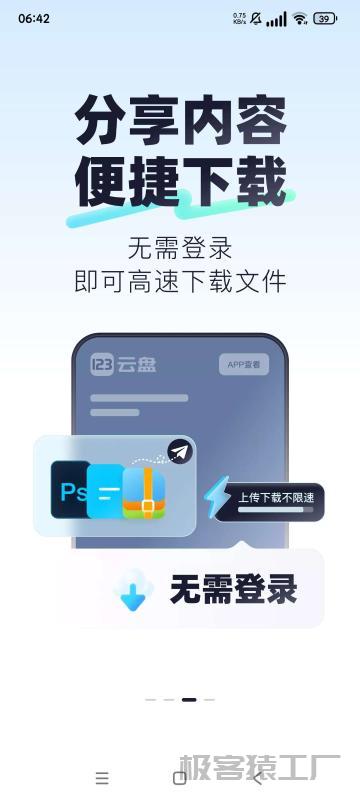 当前位置:首页🛠实用软件 📱 安卓软件 正文 【资源名称】123云盘(共存版)【资源版本】2.4.0【资源大小】45.34M【资源介绍】123云盘是一款空间大、不限速、无广告、专注大文件传输分发的云存储服务产品。【资源系统】安卓 资源下载 资源下载 123云盘2.4.0_去广告精简版_去更新不限速 更新时间:2025-05-26 下载百度网盘 标签:资源 版权所有 © 2025 极客猿工厂(https://m.gjpdf.cn/)保留所有权利。 本站资源均来源于互联网,仅供学习与交流使用,版权归原作者所有。若侵犯了您的权益,请联系我们及时处理。禁止将本站内容用于任何商业用途,违者必究。